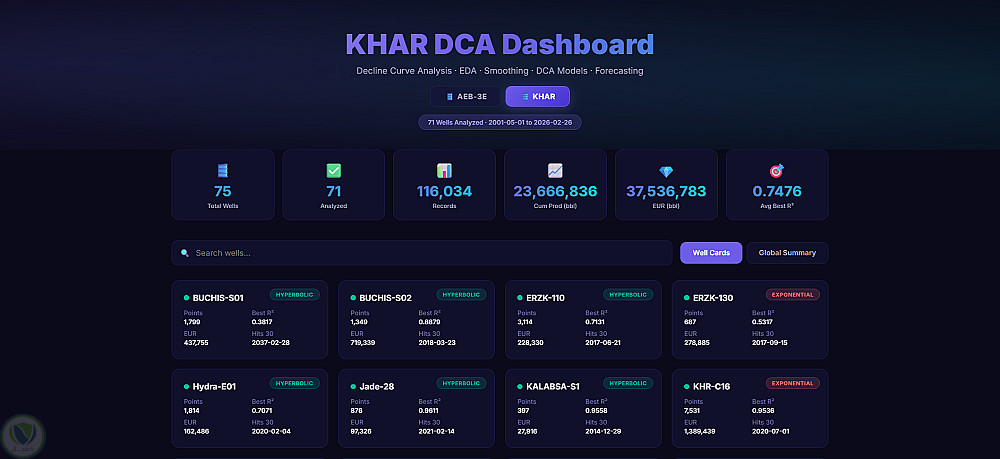 لوحة تحكم متقدمة لتحليل منحنى التدهور (DCA) والتنبؤ لآبار النفط (حقلي KHAR و AEB-3E)