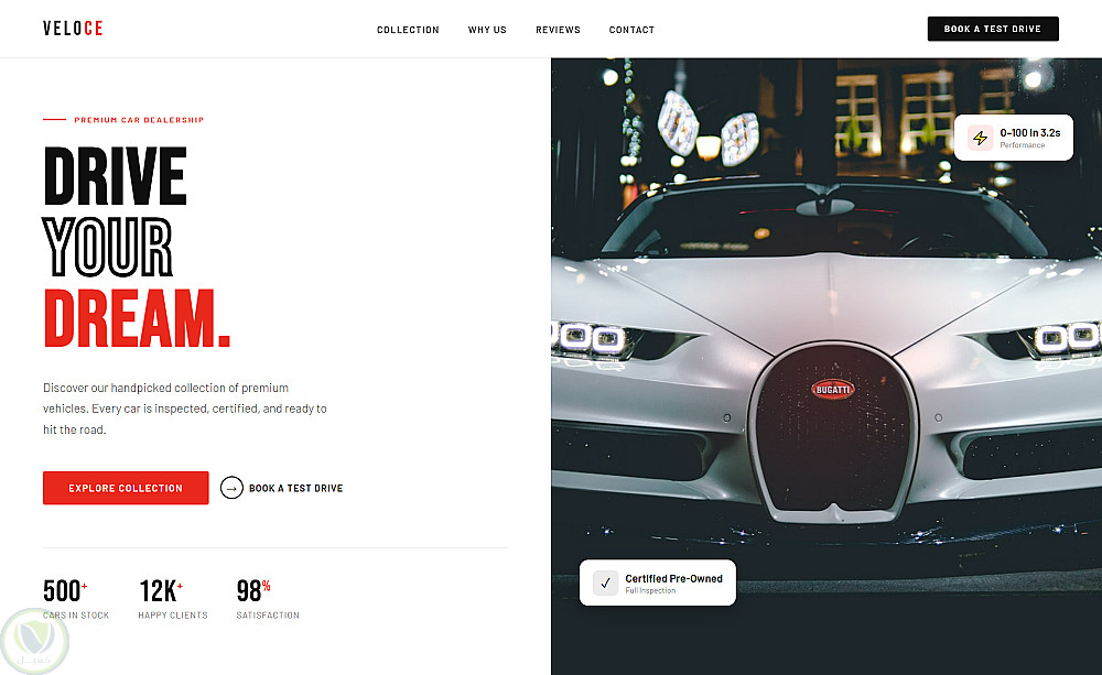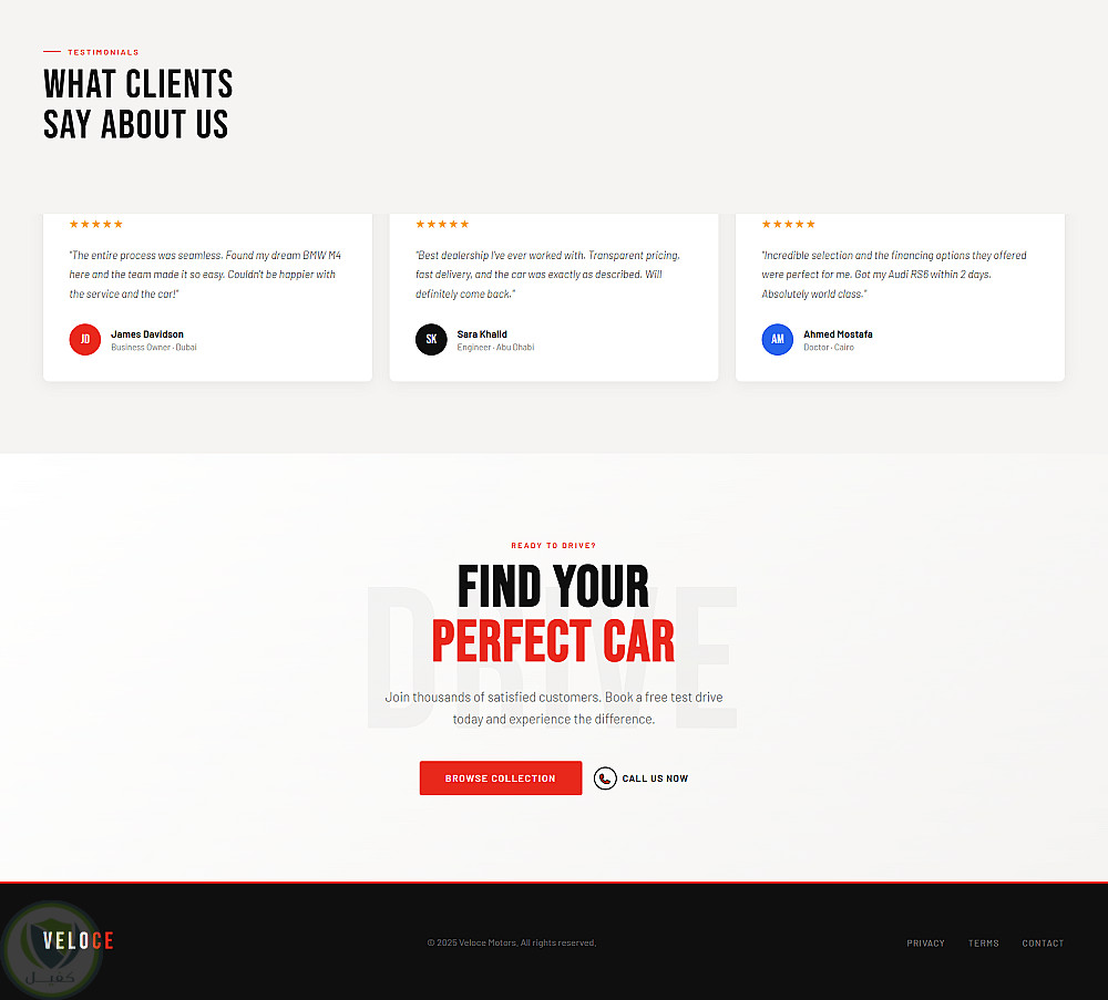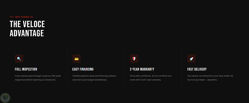 تتميز الصفحة بـ تصميم متجاوب (Responsive) يعمل بكفاءة على جميع الأجهزة مثل الموبايل والتابلت والكمبيوتر، مع تنظيم جيد للأقسام لعرض السيارات والمميزات بطريقة احترافية.