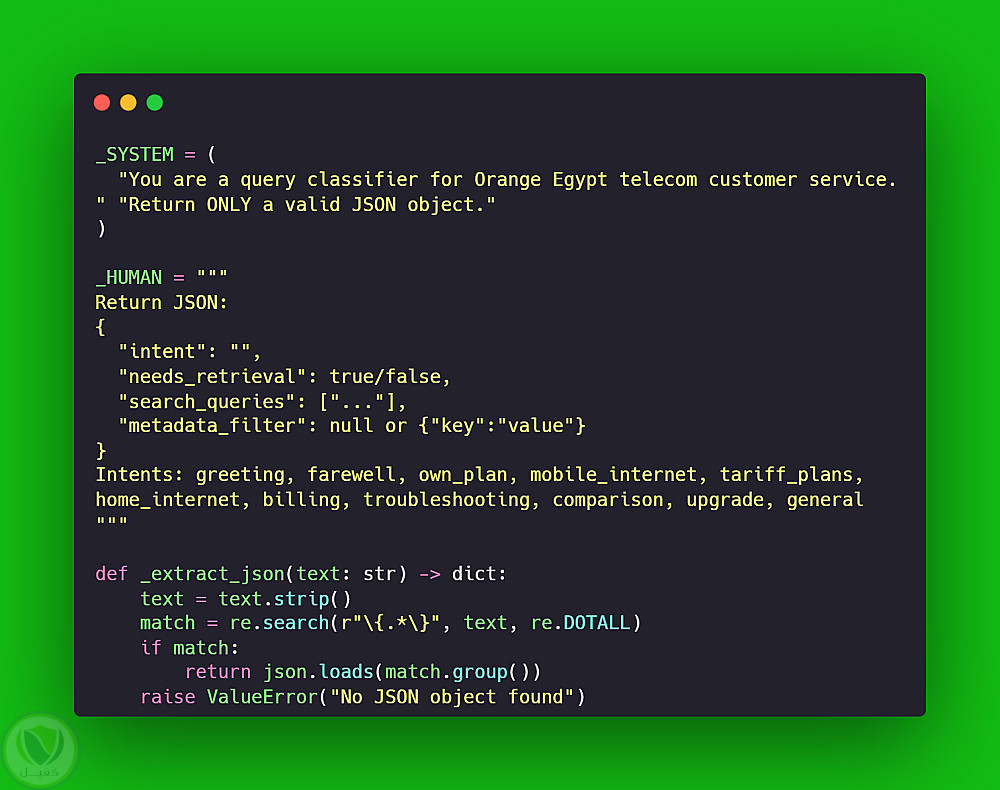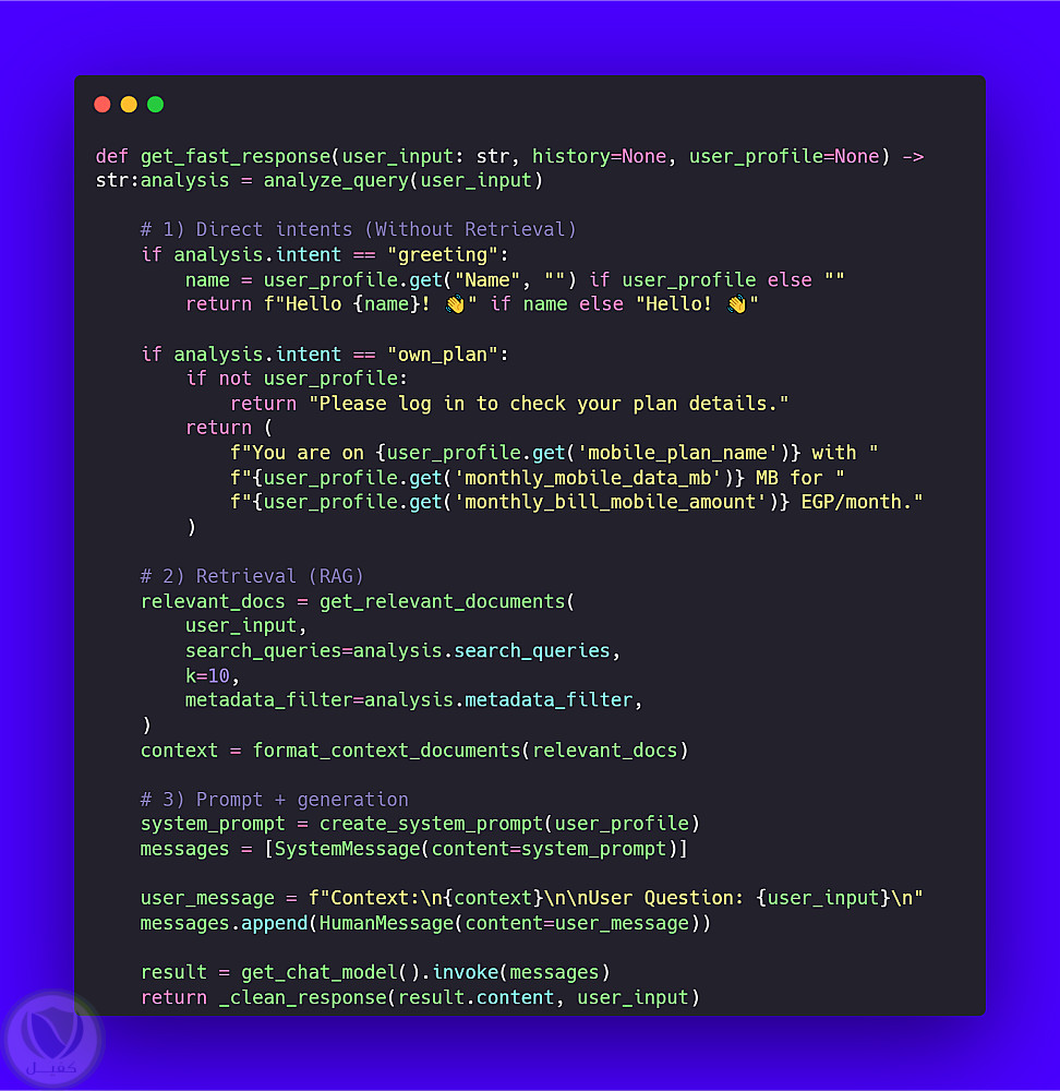 يعتمد أيضًا على تحليل نية المستخدم (Intent Classification) باستخدام نماذج LLM لفهم سؤال العميل وتوجيهه للمسار الصحيح.