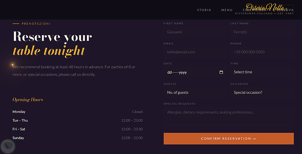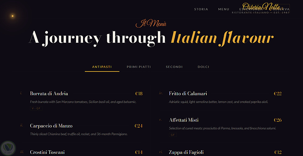كمصمم ويب، قمت بتطوير موقع . يركز الموقع على تجربة مستخدم غامرة تعكس جو المطعم الرومانسي المضاء بالشموع، مع لوحة ألوان دافئة تجمع الأسود العميق، البرتقالي الترابي، الأحمر النبيذي، والذهبي اللامع. الهيكل عبارة عن صفحة واحدة متدفقة مع أقسام: البطل للترحيب، قصة المطعم مع صور تاريخية، قائمة طعام تفاعلية بعلامات تبويب للأطباق مثل Antipasti وPrimi بوصف مفصل وسعر، صور الديكور الداخلي مع تأثيرات انتقالية، ونموذج حجز مدمج. استخدمت HTML5، CSS3 مع متغيرات للألوان، وجافا سكريبت لمؤشر فأرة يشبه لهب شمعة مع جزيئات متوهجة، وتأثيرات كشف عند التمرير بـIntersection Observer. الموقع متجاوب تمامًا للهواتف والأجهزة المكتبية، سريع التحميل (أقل من 2 ثوانٍ)، ومحسن لمحركات البحث. في الحالات الخاصة، يدعم إضافة لغات متعددة أو API للحجوزات. مثالي لقطاع الضيافة، يبرز مهاراتي في التصميم التفاعلي