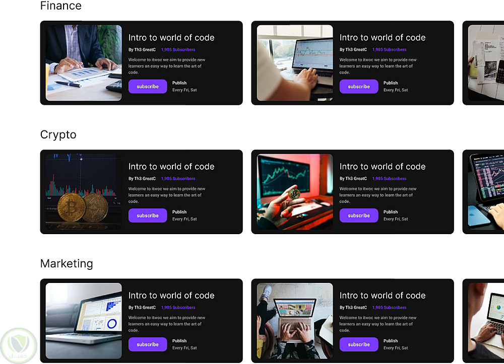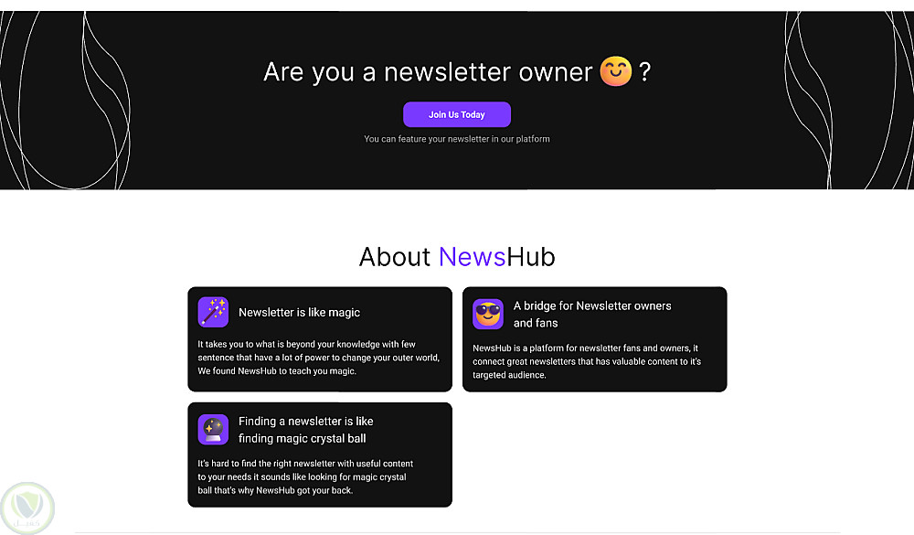 قمت بتصميم وتطوير موقع ويب احترافي باسم NewsHub، وهو منصة لعرض النشرات البريدية (Newsletters) في مختلف المجالات مثل البرمجة، التصميم، التمويل، الكريبتو، التسويق وتطوير الذات.