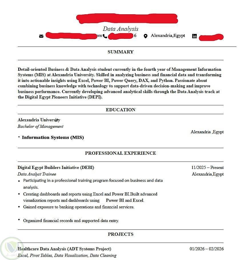 قمت بتصميم سيرة ذاتية (CV) بشكل احترافي يوضح المهارات والخبرات في مجال تحليل البيانات.