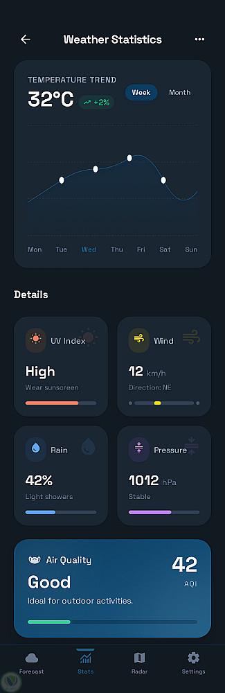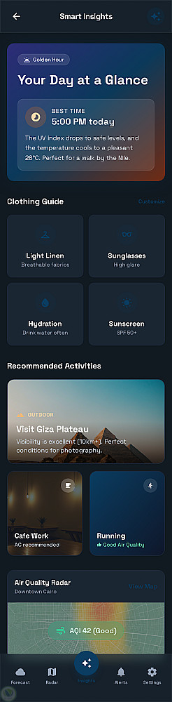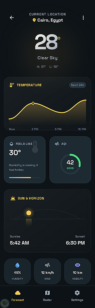 يوفر التطبيق معلومات الطقس الحالية بالإضافة إلى التوقعات المستقبلية بالساعات والأيام، مع عرض بيانات تفصيلية مثل الرطوبة وسرعة الرياح والضغط الجوي، مما يساعد المستخدم على متابعة حالة الطقس والتخطيط ليومه بسهولة.