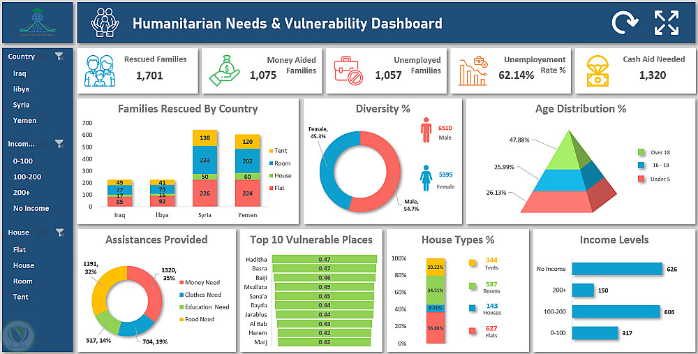 تم تصميم Dashboard لتوفير رؤية شاملة تساعد الجهات الإنسانية على متابعة المؤشرات الاجتماعية واتخاذ قرارات مبنية على البيانات لتحسين توزيع المساعدات.