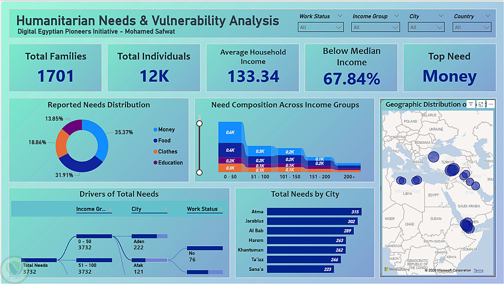 تم تصميم Dashboard لدعم المنظمات الإنسانية في تحديد الأولويات وتوجيه الموارد بشكل أكثر كفاءة بناءً على البيانات.