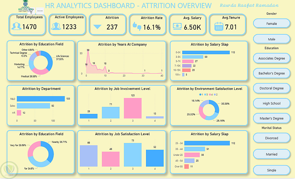 معدل الاستقالات (Attrition Rate): معرفة الأسباب وربطها بالعوامل المختلفة مثل (السن، القسم، الرضا الوظيفي).