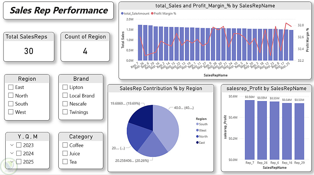 في هذا المشروع قمت بتحليل بيانات مبيعات كاملة وبناء نموذج بيانات احترافي باستخدام Star Schema لربط جدول العمليات (Fact Sales) بجداول الأبعاد مثل Customer وProduct وSalesRep وDate. شملت خطوات العمل فهم العلاقات بين الجداول، تنظيف البيانات وتجهيزها للتحليل، ثم إنشاء نموذج بيانات منظم لتحسين الأداء ودقة النتائج. بعد ذلك قمت ببناء مجموعة من مؤشرات الأداء (KPIs) باستخدام DAX مثل إجمالي المبيعات، إجمالي الأرباح، نسبة الربح، ومتوسط قيمة الطلب، بالإضافة إلى تحليل أداء مندوبي المبيعات. كما تم تنفيذ تحليل زمني للمبيعات (شهري، ربع سنوي، سنوي) وتصميم Dashboards تفاعلية تدعم الفلترة والتحليل العميق. يوفر المشروع تحليلات تساعد على تقييم الأداء العام للمبيعات، دراسة سلوك العملاء، مقارنة أداء المنتجات، واكتشاف الاتجاهات والأنماط الموسمية.