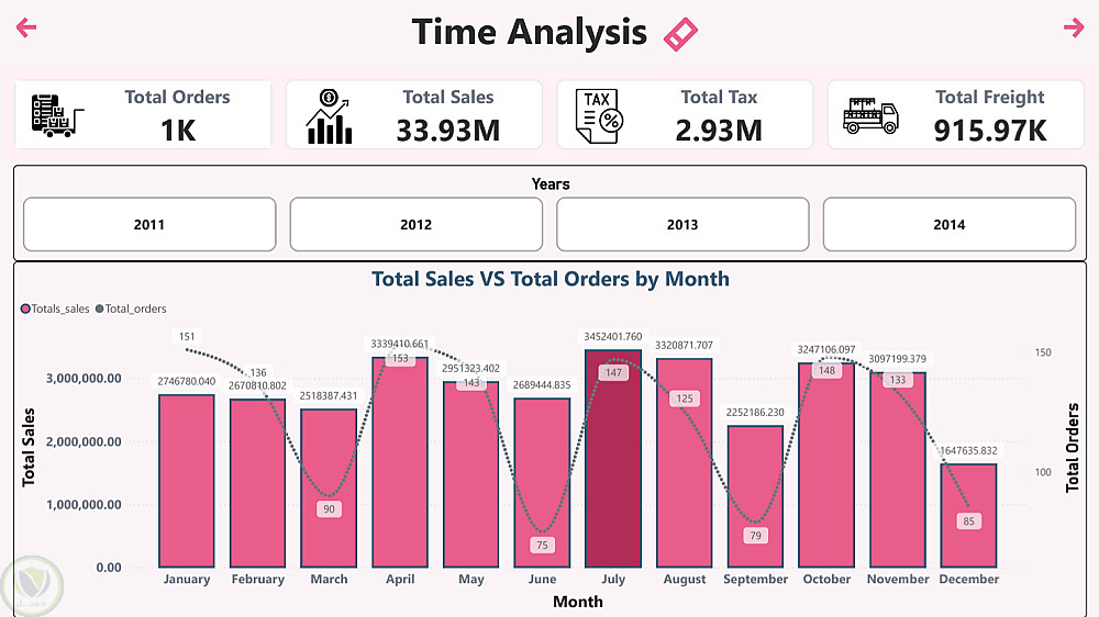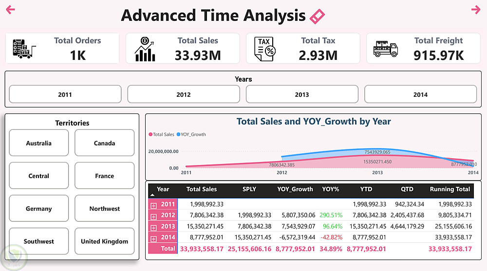 التحليل الزمني (العادي والمتقدم): تتبع أداء المبيعات، مع حساب معدلات النمو السنوي (YOY) والمبيعات التراكمية (YTD).