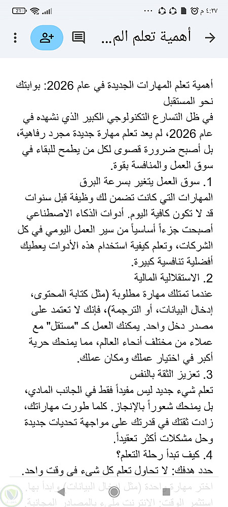 نموذج كتابة مقال حصري ومنظم يتحدث عن أهمية تطوير المهارات في عام 2026. قمت بتنسيق النص بشكل احترافي باستخدام مستندات جوجل، مع مراعاة التدقيق اللغوي وتقسيم المحتوى إلى فقرات سهلة القراءة