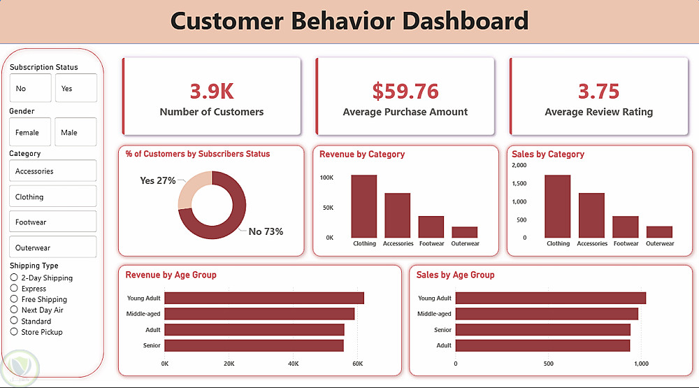 تحتوي الـDashboard أيضًا على فلاتر تفاعلية تسمح بتخصيص التحليل وفقًا لحالة الاشتراك، والنوع، والفئة، ونوع الشحن. يساعد هذا التحليل الشركات على فهم سلوك العملاء بشكل أعمق، وتحديد الفئات الأكثر تحقيقًا للإيرادات، وتحسين استراتيجيات التسويق والمبيعات من خلال رؤى واضحة وقابلة للتنفيذ.