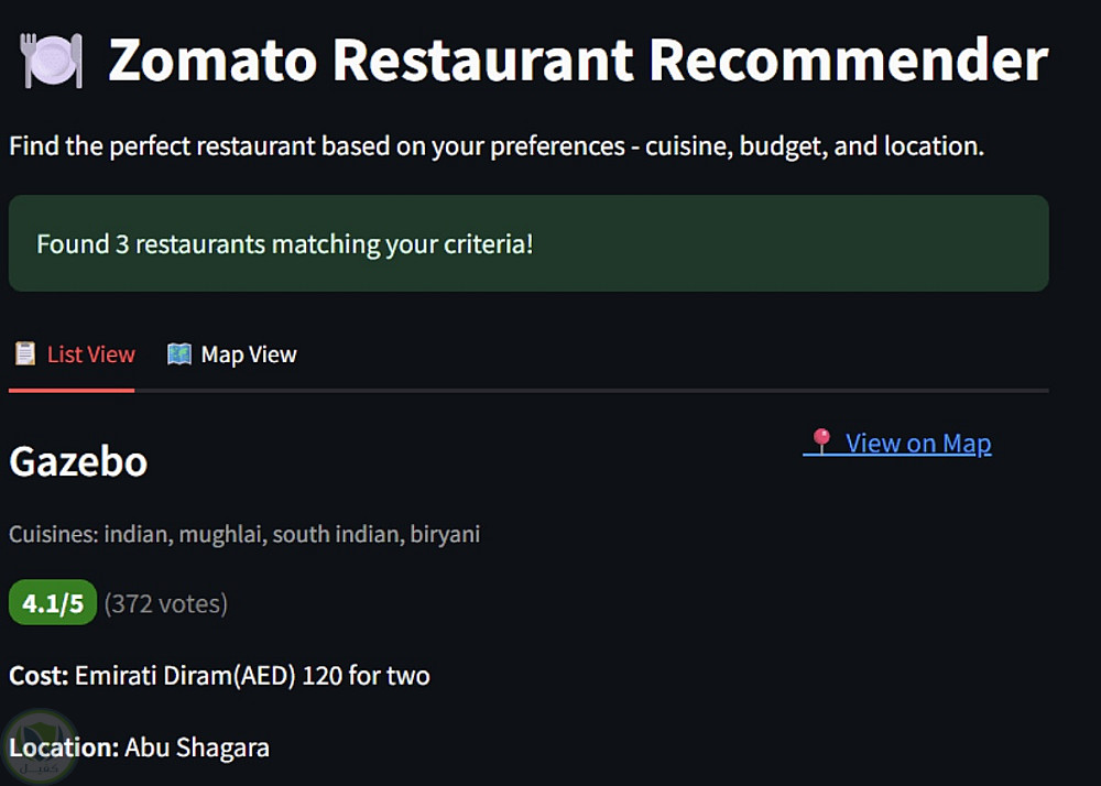 تم تطوير النظام باستخدام Python وPandas وStreamlit مع الاعتماد على بيانات حقيقية من مجموعة بيانات Zomato لتوليد توصيات مخصصة للمستخدمين.
