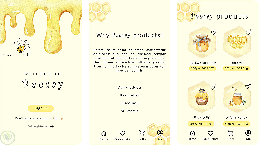 تصميم 3 شاشات لموقع الكتروني تخيلي لبيع عسل النحل تحتوي على تعريف مبدئي بتاريخ الشركة المصنعة و كيفية تصنيع العسل