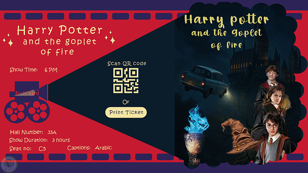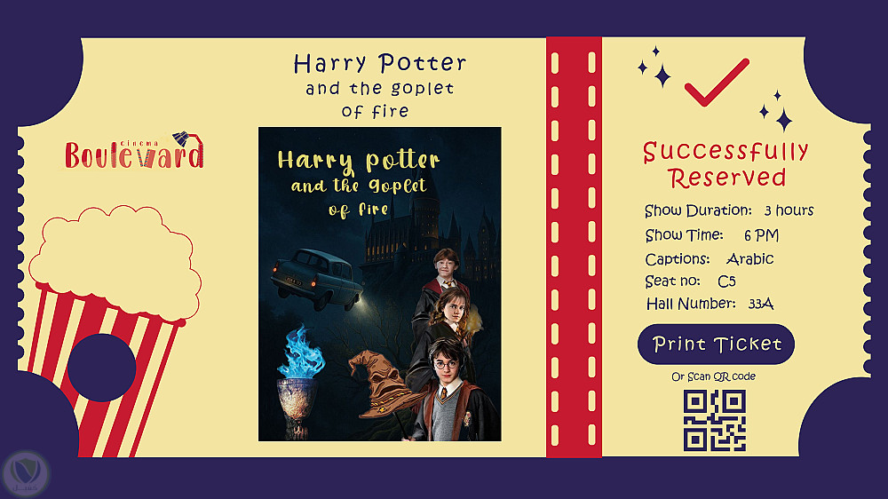 3. الشاشة الثالثة (بتصميمين مختلفين) تظهر رسالة تأكيدية بنجاح الحجز مع كافة تفاصيل الفيلم المعروض و امكانية طباعة التذكرة أو مسح QR code