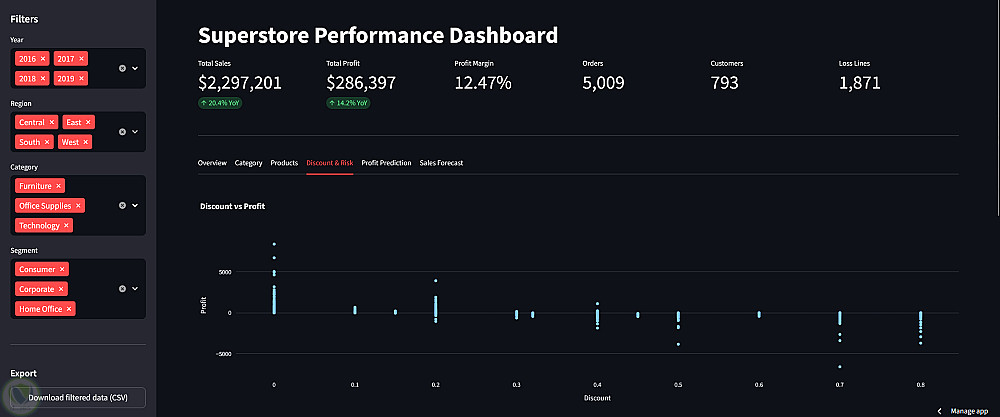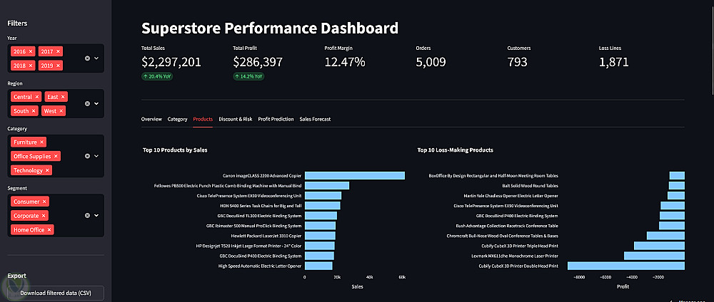 مشروع احترافي يجمع بين تحليل البيانات وMachine Learning لتحويل بيانات المبيعات إلى قرارات ذكية قابلة للتنفيذ. في هذا العمل قمت بتحليل بيانات Superstore 2019 لاستخراج أهم المؤشرات والأنماط المؤثرة في الأداء، ثم تطوير Dashboard تفاعلي يسهّل متابعة المبيعات والأرباح والفئات المختلفة بشكل بصري واضح. ولم يتوقف المشروع عند التحليل فقط، بل تم أيضًا بناء نماذج للتنبؤ بالمبيعات المستقبلية وتحديد ما إذا كانت الصفقة المتوقعة ستحقق ربحًا أم خسارة. المشروع يعكس القدرة على الدمج بين Data Analysis وData Visualization وPredictive Modeling داخل حل عملي متكامل يساعد أصحاب الأعمال على الفهم الأفضل واتخاذ قرارات أكثر دقة.