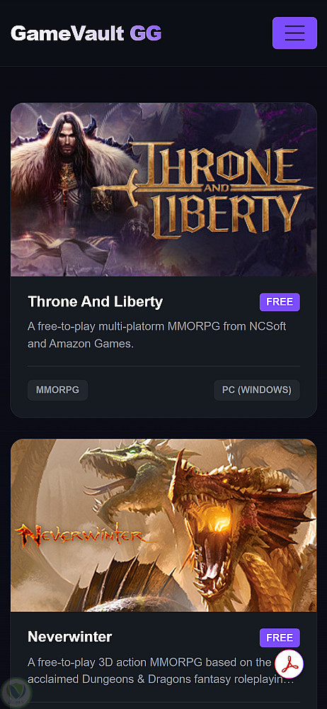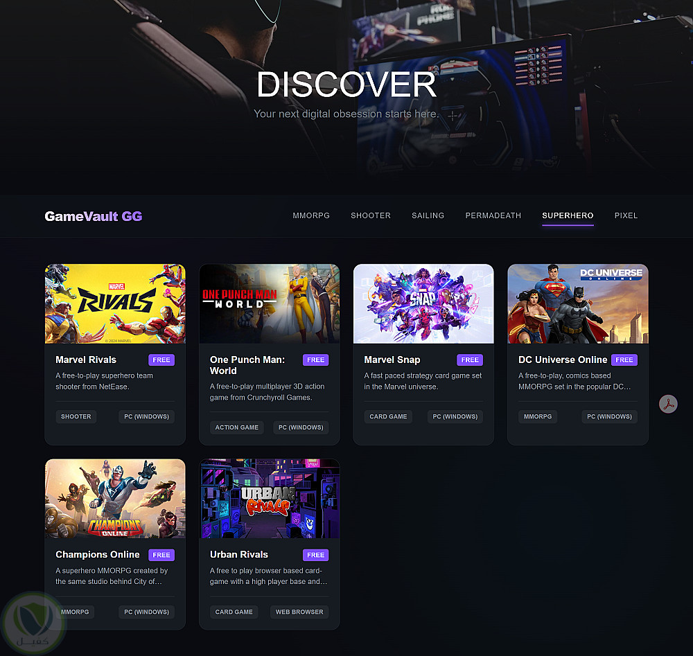 يعتمد الموقع على Navbar تحتوي على تصنيفات مثل: MMORPG — Shooter — Sailing — Permadeath — Superhero — Pixel، مع إمكانية فتح صفحة تفاصيل لكل لعبة وعرض معلوماتها بالكامل، بالإضافة إلى رابط مباشر لفتح موقع اللعبة.