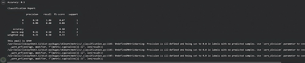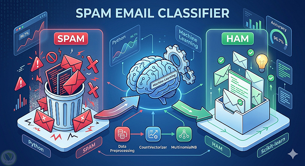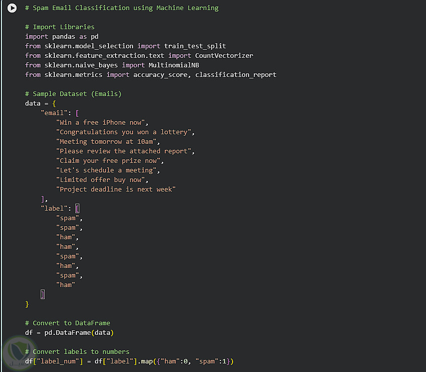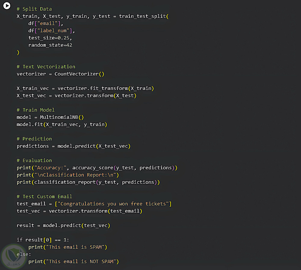 في هذا المشروع قمت ببناء نموذج بسيط لتصنيف رسائل البريد الإلكتروني إلى رسائل مزعجة (Spam) أو غير مزعجة باستخدام خوارزميات تعلم الآلة.