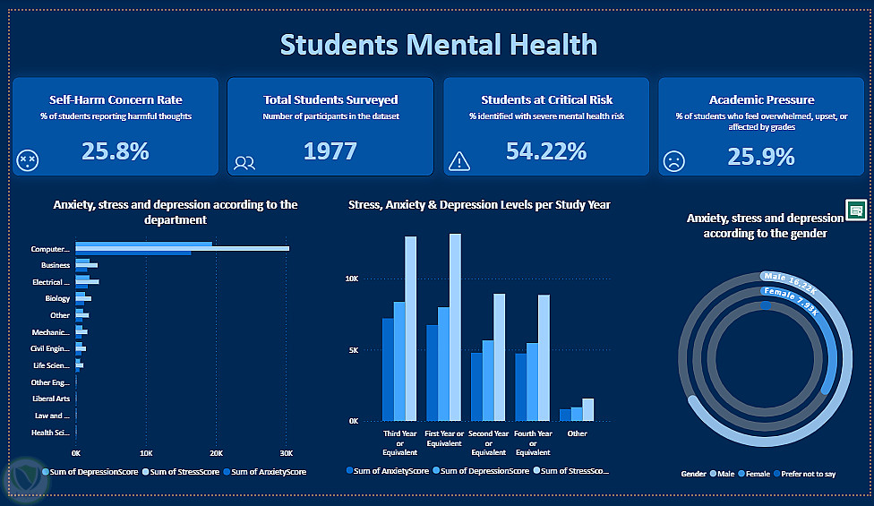 لوحة تحليلية تفاعلية لقياس مؤشرات الصحة النفسية للطلاب بناءً على بيانات استبيان شامل.