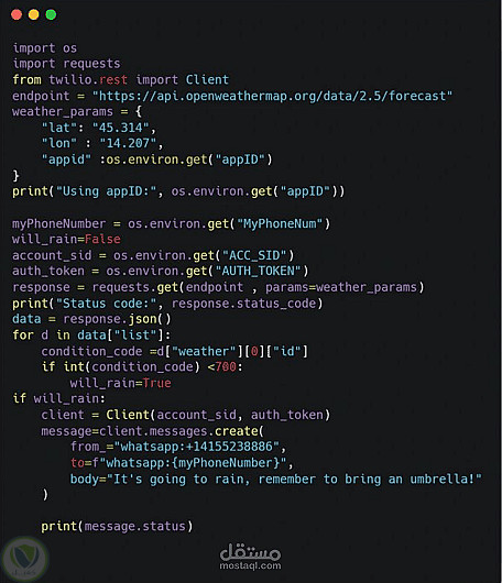 هذا المشروع عبارة عن نظام ذكي لمراقبة حالة الطقس وإرسال تنبيهات تلقائية عبر الرسائل القصيرة باستخدام Python.