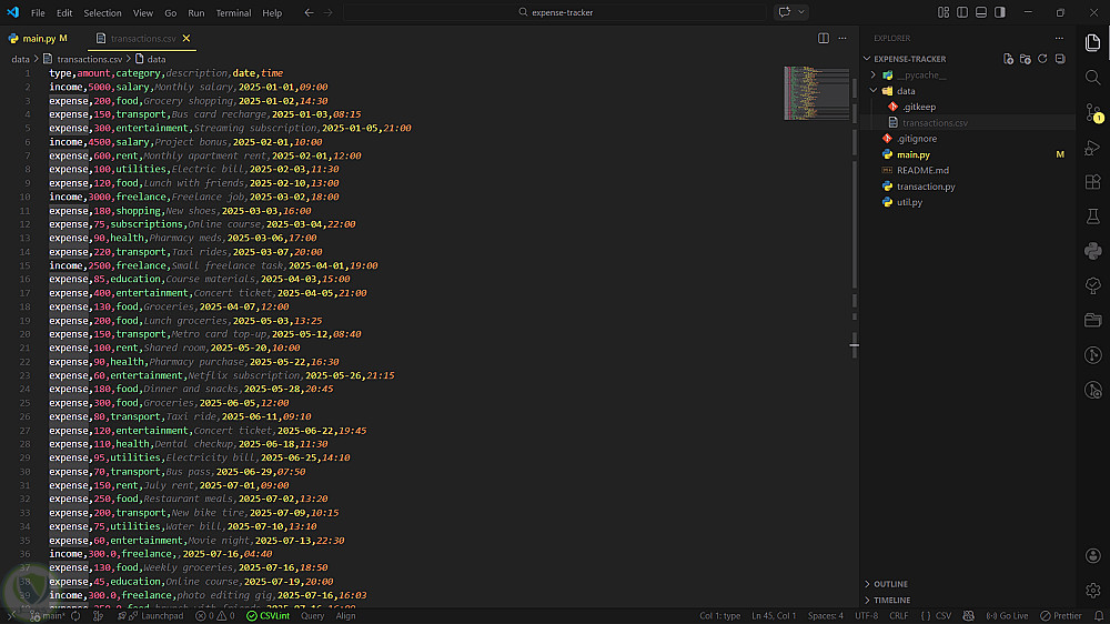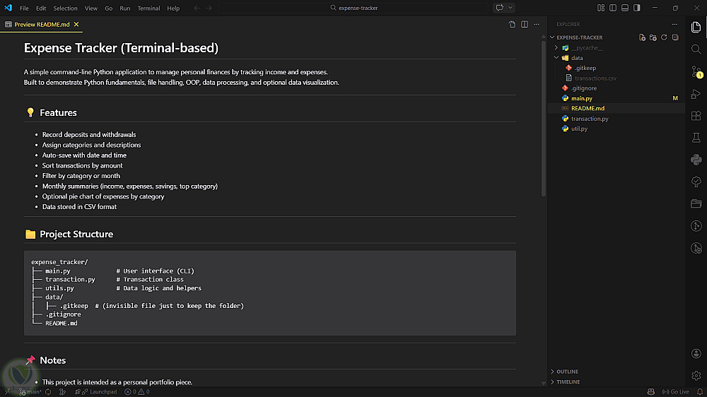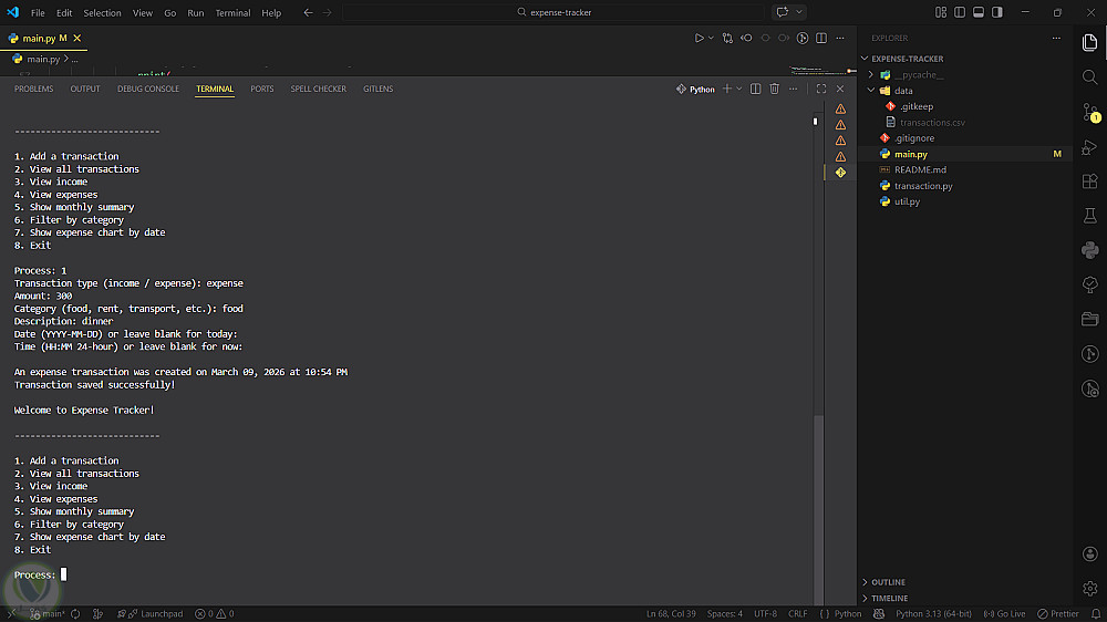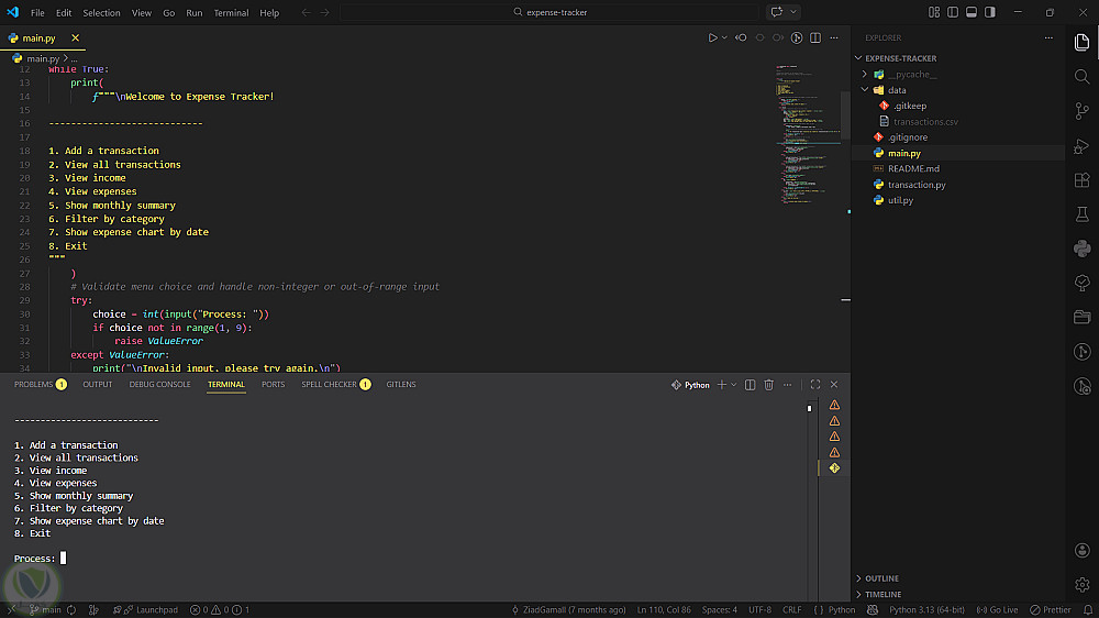 مشروع عملي قمت بتطويره باستخدام لغة Python لتسجيل المصاريف اليومية وتنظيمها. يتيح التطبيق إضافة المصروفات وتصنيفها وعرض تقارير بسيطة توضح إجمالي المصاريف حسب الفئة أو الفترة الزمنية.