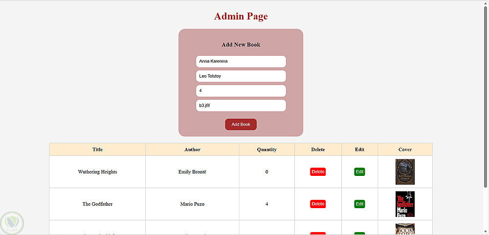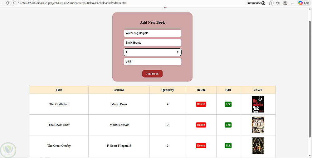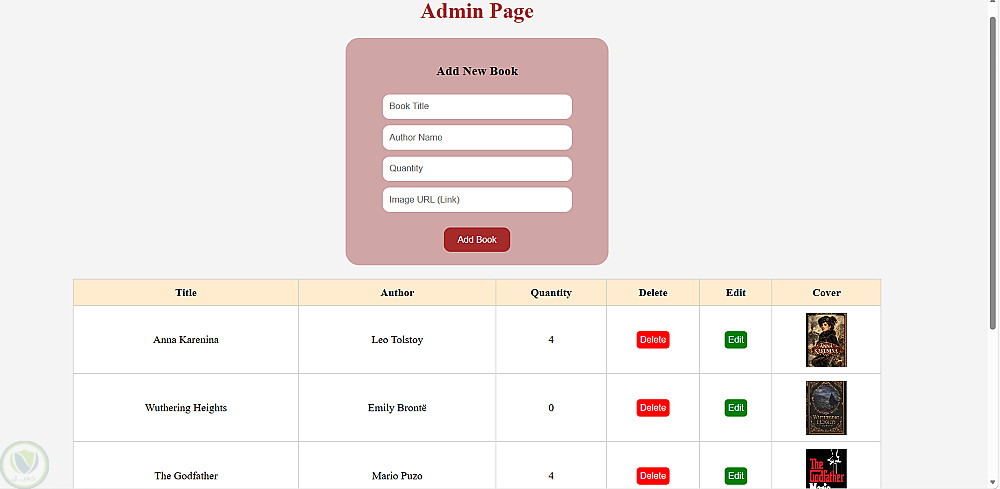 لوحة تحكم المسؤول: تتيح إضافة، حذف، وتعديل بيانات الكتب (العنوان، المؤلف، الكمية، والغلاف).