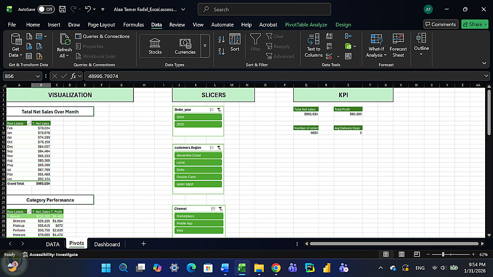 قمت بإنشاء Pivot Tables لاستخراج مؤشرات الأداء الرئيسية مثل صافي المبيعات، الأرباح، عدد الطلبات، نسبة المرتجعات ومتوسط أيام التوصيل، مع تصميم Dashboard تفاعلي يتيح تحليل البيانات بسهولة باستخدام الفلاتر (Slicers).
