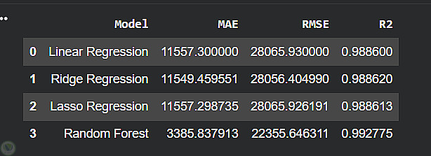 تم بناء عدة نماذج انحدار (Linear, Ridge, Lasso, Random Forest) وتقييمها باستخدام MAE وRMSE وR². أظهرت النتائج تفوق نموذج Random Forest حيث حقق أفضل أداء (MAE≈3385، RMSE≈22355، R²≈0.993)، مما يعكس قدرته على التقاط العلاقات المعقدة بدقة أعلى.