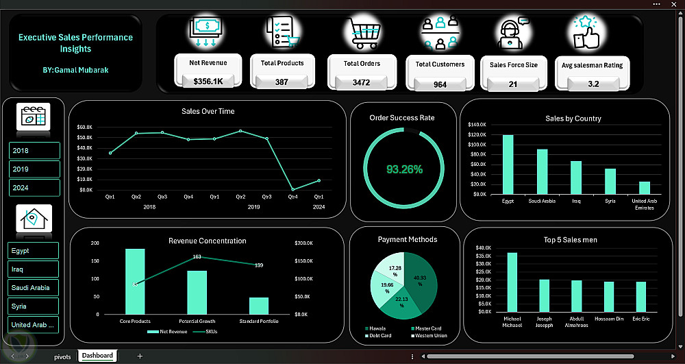 الأداء الجغرافي والتشغيلي: تتبع المبيعات حسب الدولة، تحليل طرق الدفع، ومراقبة معدل نجاح الطلبات.