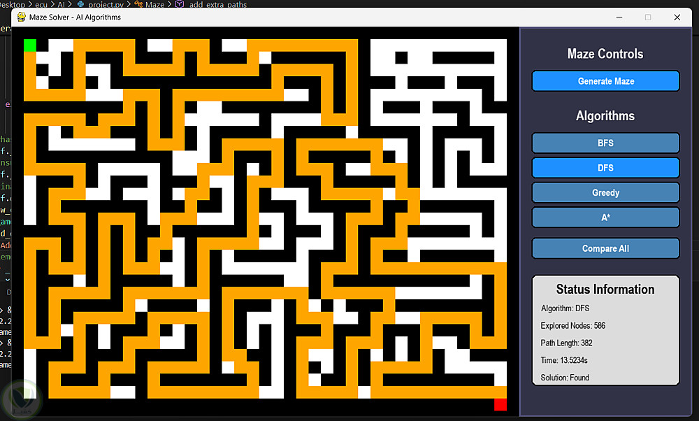 لقد قمتُ بإنشاء نظام يقوم بتوليد متاهات عشوائية وحلّها باستخدام خوارزميات البحث في الذكاء الاصطناعي مثل BFS وDFS وGreedy.