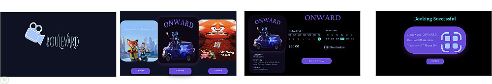 الاعتماد على تباين الألوان (الأسود والأرجواني) لإبراز المحتوى وتوفير تجربة بصرية مريحة للمستخدم (UX)، مع التركيز على سهولة الوصول للمعلومات الأساسية مثل مواعيد العرض ومدة الفيلم.