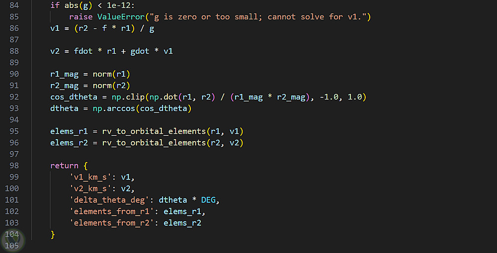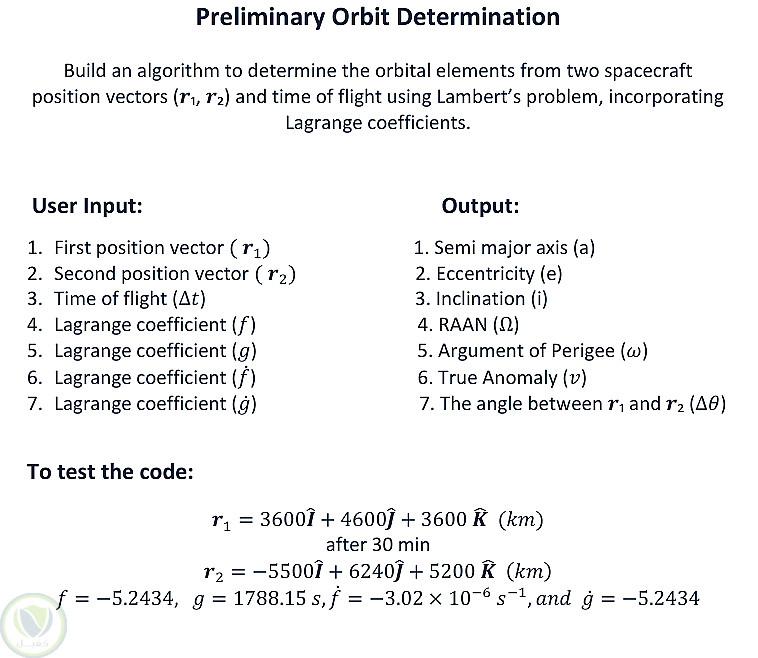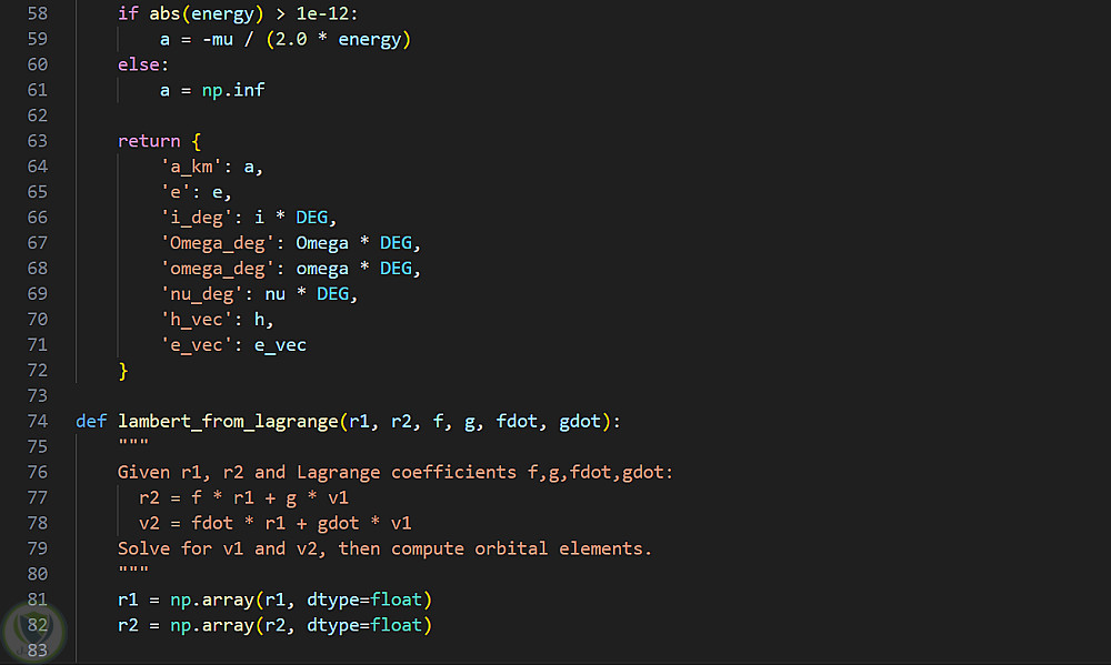 أقدم حلاً برمجياً متخصصاً في مجال الديناميكا الفلكية لحساب المدارات الفضائية باستخدام مسألة لامبرت (Lambert's Problem)، والتي تعد من الطرق الأساسية في تحديد المدارات. يعتمد الحل على إدخال متجهي موقع للمركبة الفضائية وزمن الطيران بينهما، بالإضافة إلى معاملات لاغرانج (Lagrange Coefficients)، لحساب السرعات والعناصر المدارية الكاملة.