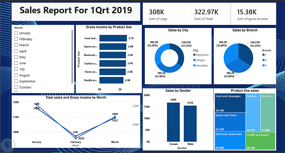 اشتغلت على تنظيف وتجهيز البيانات، وبعد كده صممت داشبورد تفاعلي بيعرض أهم مؤشرات الأداء خلال الربع الأول من 2019، زي إجمالي المبيعات، الأرباح، وعدد الطلبات.