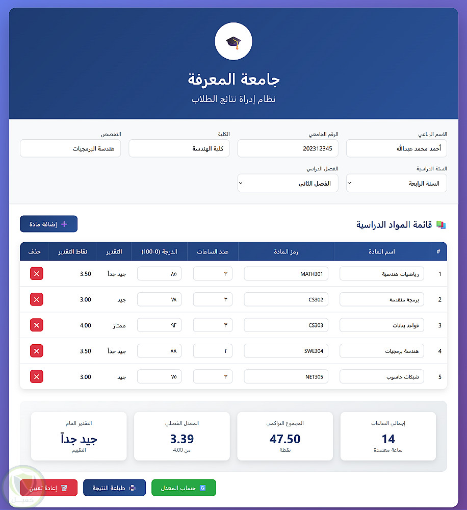 قمت بتصميم موقع لنتيجة جامعة يوجد فيه خانة الاسم والسمستر والفصل ومواد تقدر تزيد وتنقص والنتيجه ومعدل العام ويمكن طباعة النتيجة لكل طالب باستخدام :