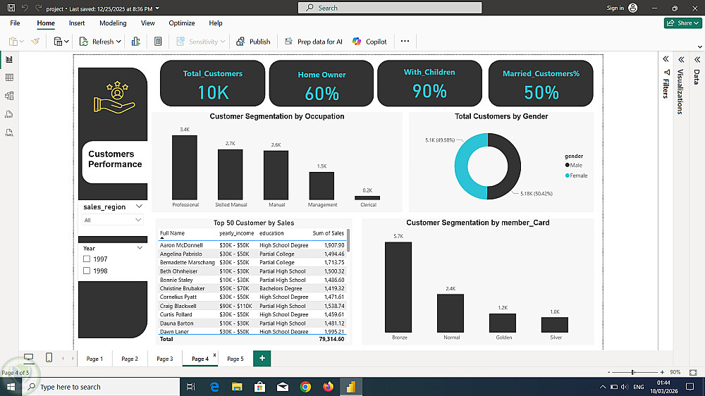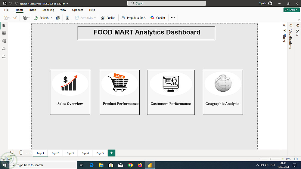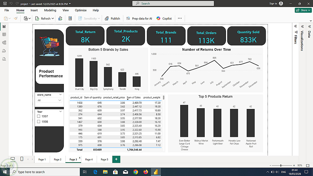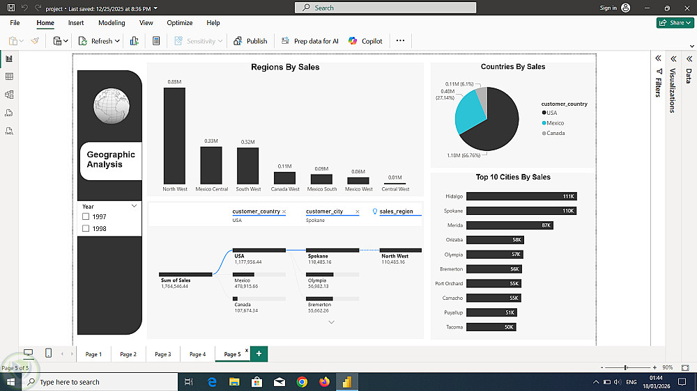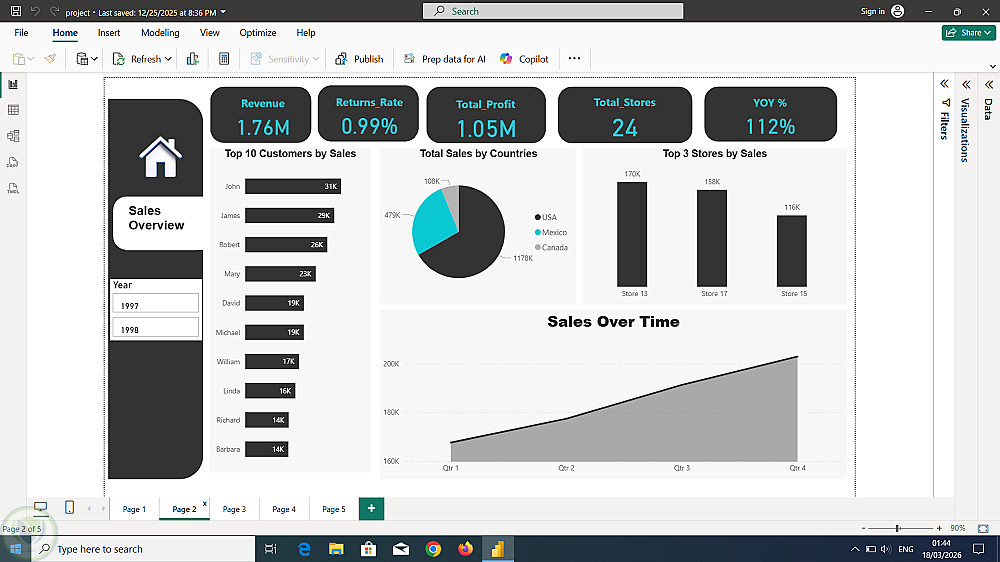 كما يحتوي على فلاتر تفاعلية (مثل التاريخ، المنطقة، الفئة) تتيح للمستخدم استكشاف البيانات بشكل أعمق.