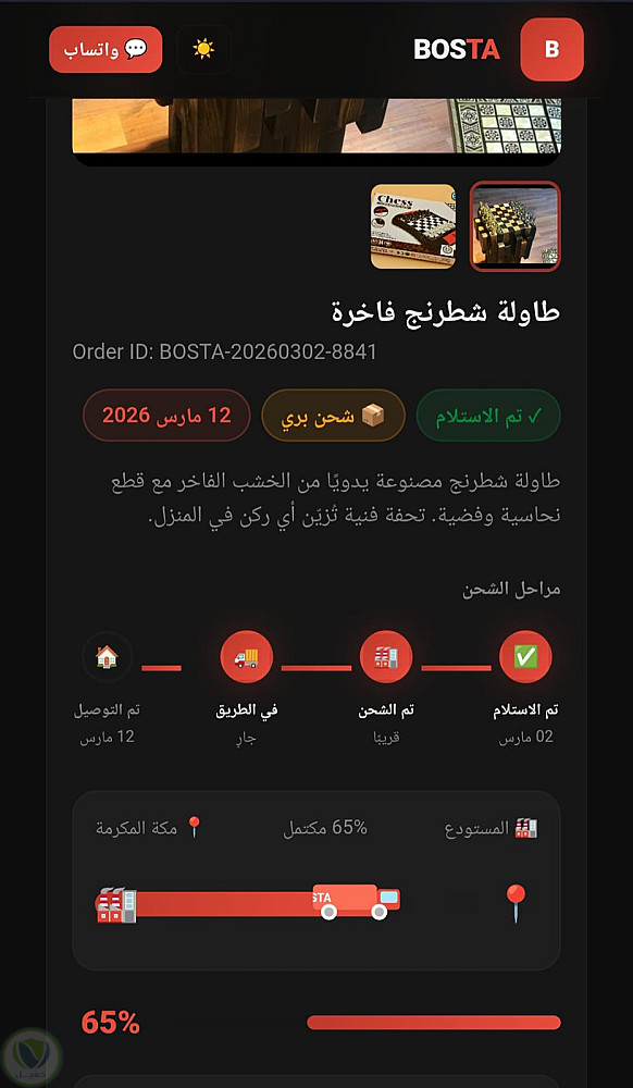 ويب سايت اسمه بوستا عباره عن بيدج لبيع طاوله شطرنج مميزه و فيها خطوات البيع ووصول الاوردر للمندوب و رقم المندوب ورقم الواتس اب