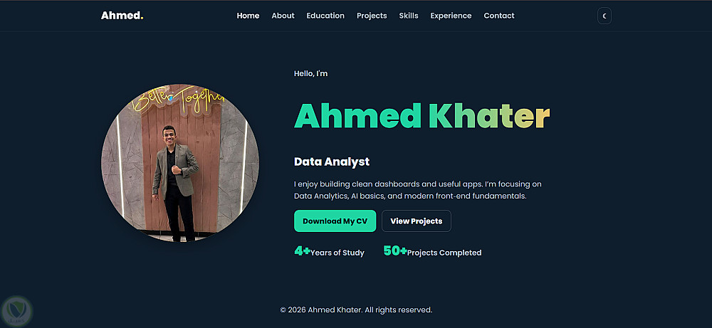 هذا مشروع قمت بتنفيذه لتطوير موقع بورتفوليو شخصي احترافي، يهدف إلى عرض الأعمال والمهارات والخبرات بطريقة واضحة ومتناسقة.