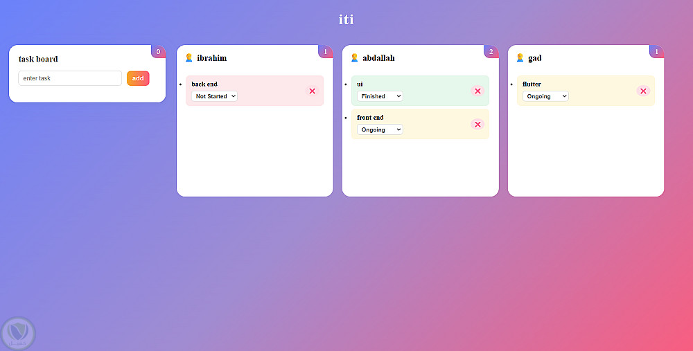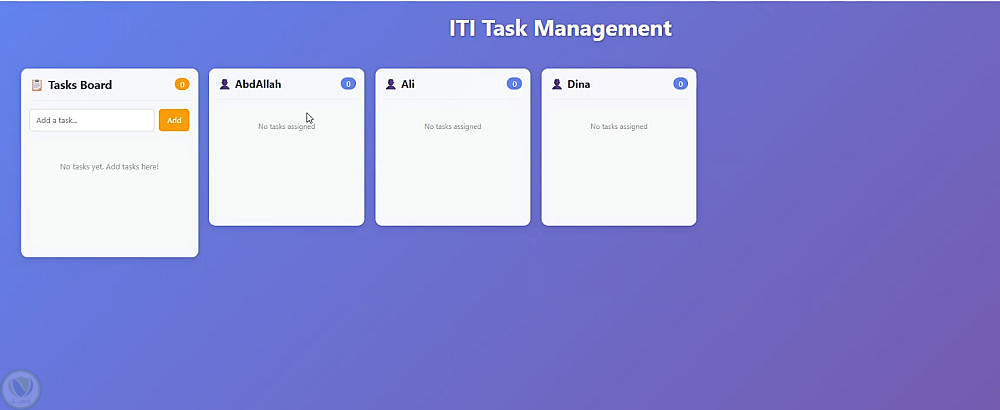 تطبيق ويب بسيط لإدارة وتتبع المهام داخل فريق عمل، يتيح للمدير إنشاء لوحة مهام وتوزيعها على أعضاء الفريق بطريقة تفاعلية باستخدام خاصية السحب والإفلات (Drag & Drop).