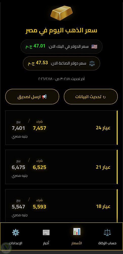 تطبيق سعر الذهب اليوم في مصر لحظيا رفيقك التقني المتطور لمتابعة الأسعار في مصر لحظة بلحظة. تم بناء التطبيق لربط المستخدم بنبض السوق مباشرة، موفراً تحديثات حية لـ سعر جرام الذهب عيار 21، عيار 24، وعيار 18، مع ربط دقيق بـ سعر الدولار في البنوك وسعر "دولار الصاغة" الحصري.