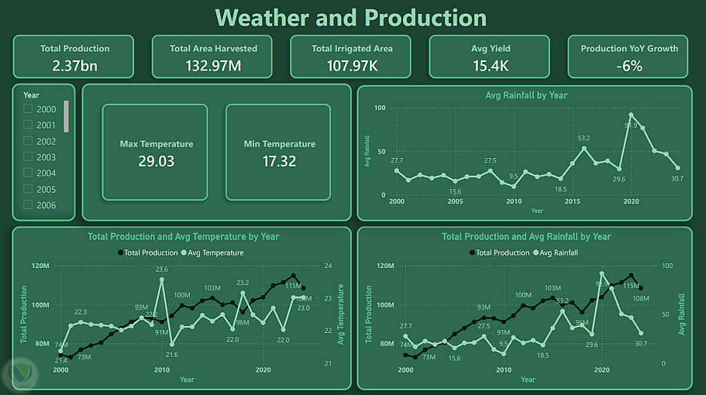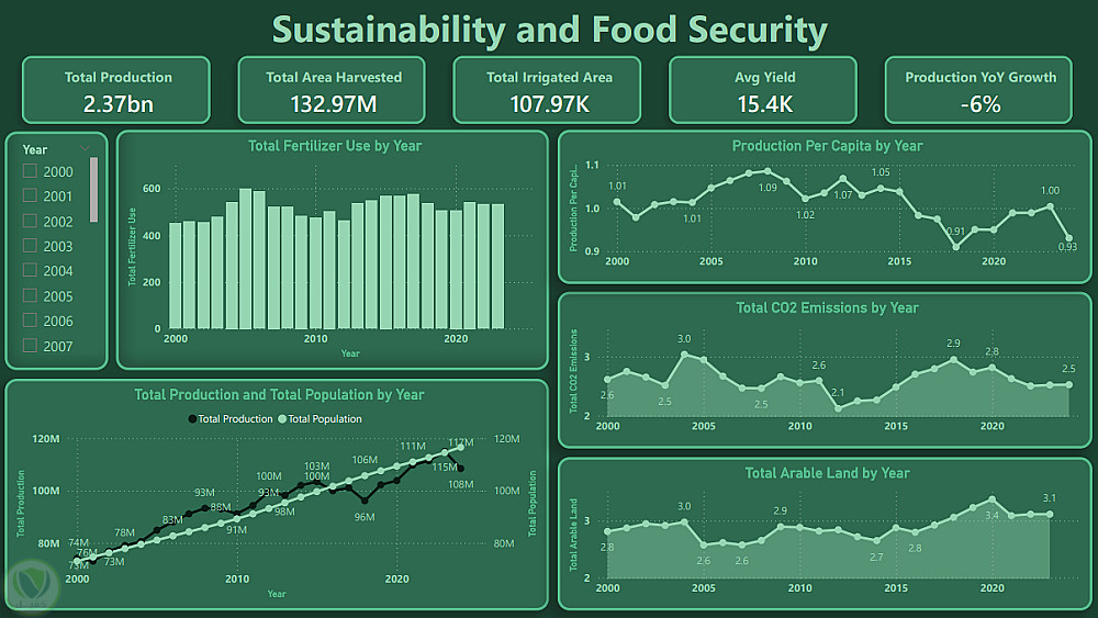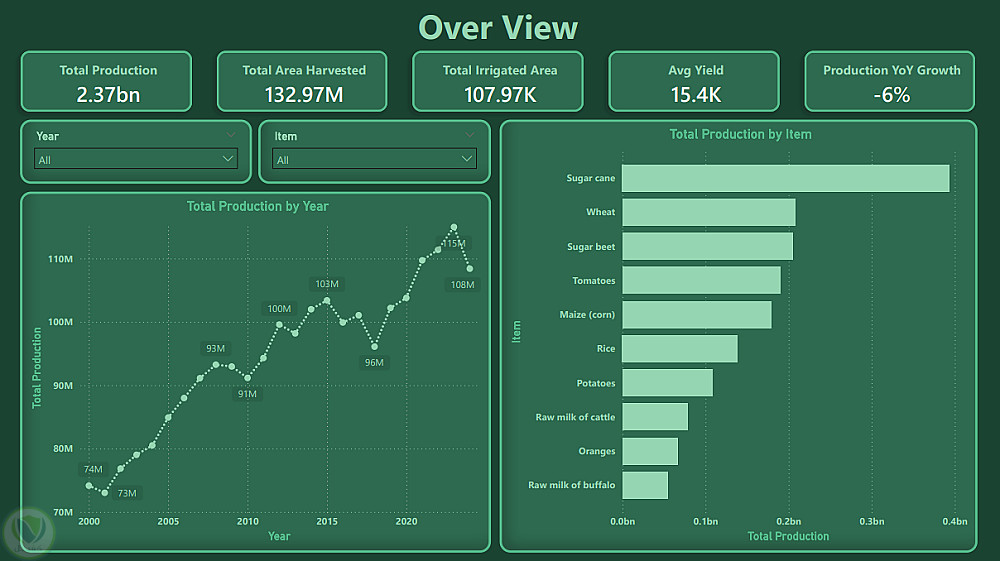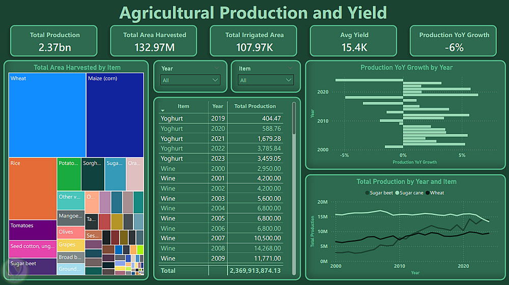 مشروع تحليل بيانات شامل يدرس قطاع الإنتاج الزراعي وأثره البيئي عالمياً. يحول الداشبورد أكثر من **2.37 مليار وحدة إنتاج** إلى رؤى تفاعلية تربط بين الغذاء، الموارد، والاستدامة.