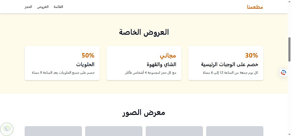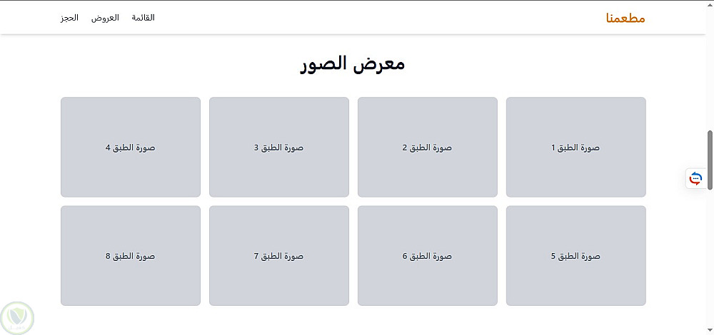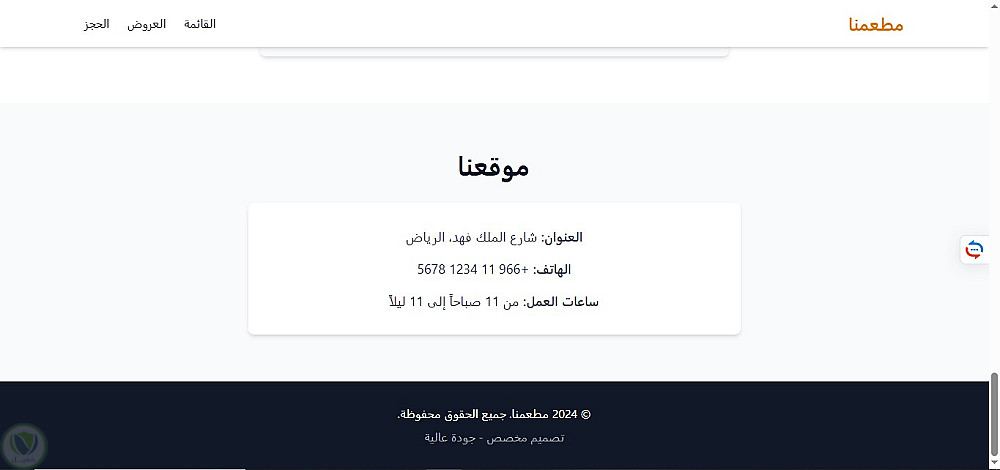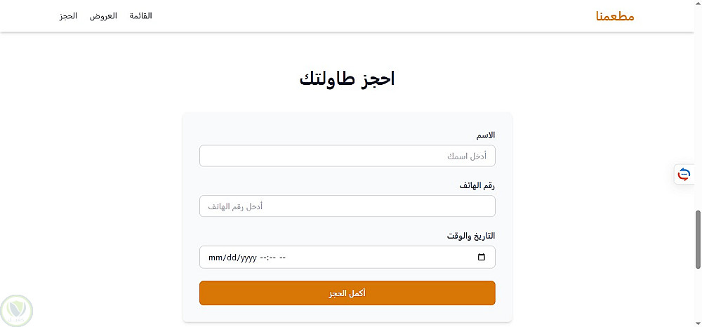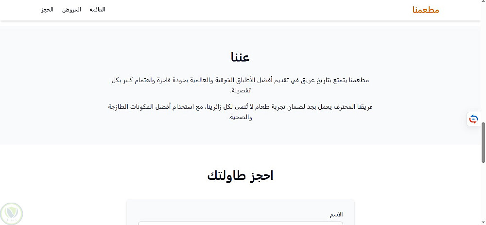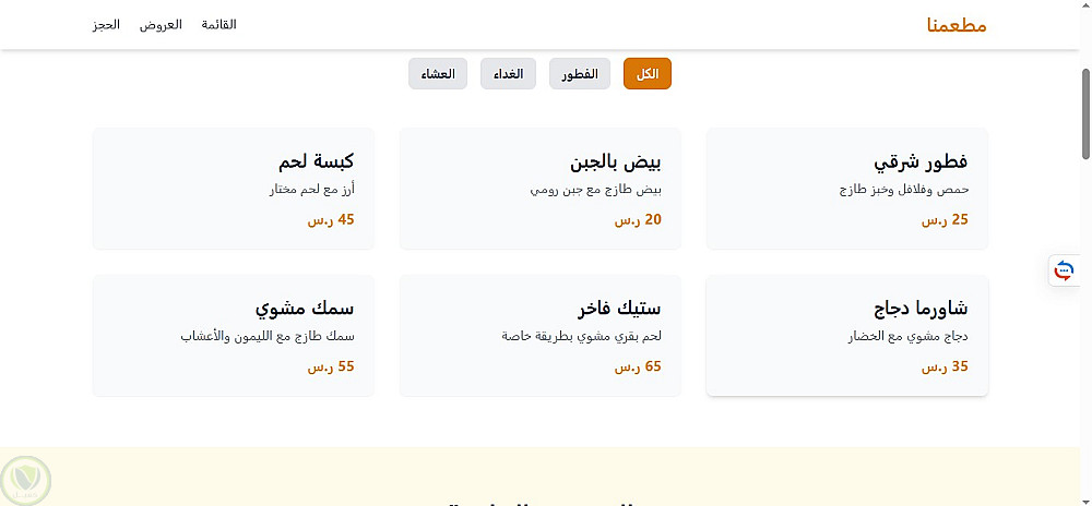 صفحة هبوط لمطعم باللغة العربية، تم تطويرها باستخدام HTML5 وTailwind CSS مع التركيز على تصميم بسيط وتجربة مستخدم مريحة. تم استخدام JavaScript (ES6) لإضافة تفاعلات خفيفة مثل فلترة قائمة الطعام والتمرير السلس. الصفحة متجاوبة بالكامل وتعتمد على عرض المحتوى بشكل ثابت (Static)