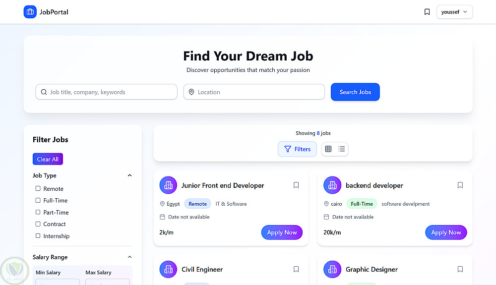 كما توفر المنصة خيارات متعددة لأنواع الوظائف (Full-time, Part-time, Internship, Onsite).