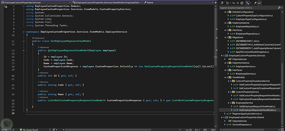 قمت بتطوير نظام يتيح إنشاء وإدارة خصائص ديناميكية مخصصة للموظفين باستخدام ASP .NET Core. يتيح النظام إضافة خصائص مختلفة مثل النصوص والتواريخ والأرقام والقوائم المنسدلة، مع إمكانية تحديد الحقول المطلوبة والتحقق من صحة البيانات قبل الحفظ. يدعم النظام إنشاء هذه الخصائص وربطها بنماذج الموظفين وعرض بيانات الموظفين مع خصائصهم بشكل منظم، مما يوفر مرونة عالية في إدارة بيانات الموظفين وتوسيع النظام بسهولة.