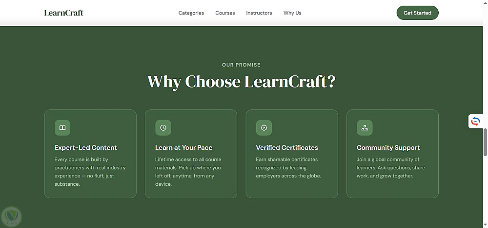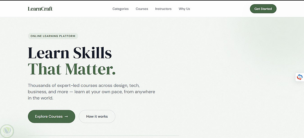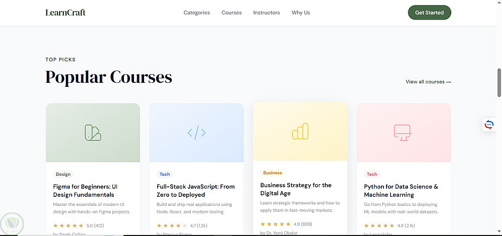 صفحة هبوط لمنصة تعليمية تعرض الكورسات والتصنيفات المختلفة، تم تنفيذها باستخدام HTML5 وTailwind CSS مع تصميم بسيط ومنظم. تم استخدام JavaScript (ES6) لإضافة تفاعل بسيط مثل الفلترة بين التصنيفات والتمرير السلس. المشروع Static بالكامل