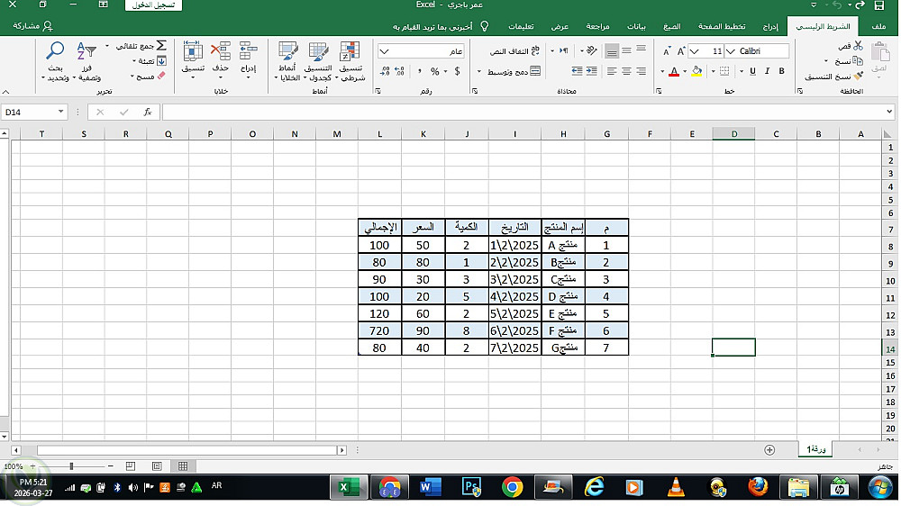 قمت بإدخال و تنظيم البيانات مبيعات داخل Excel بشكل دقيق و منسق مع استخدام الجداول و الصيغ الحسابية لحساب الإجمالي مما يسهل قراءة البيانات و تحليلها بطريقة احترافية