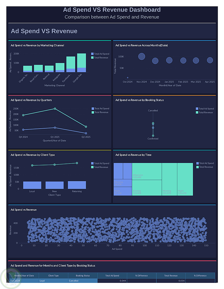 قمت بتنفيذ Dashboard احترافي لتحليل العلاقة بين الإنفاق الإعلاني (Ad Spend) والإيرادات (Revenue) بهدف فهم تأثير الحملات التسويقية على الأرباح.