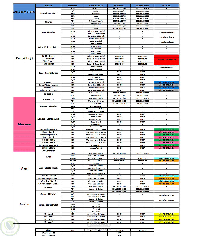 تم تصميم وتنفيذ بنية شبكة متكاملة لمؤسسة متعددة الفروع، تشمل القاهرة (المقر الرئيسي)، المنصورة، الإسكندرية، وأسوان، باستخدام Hierarchical Network Design (Core, Distribution, Access Layers). تم إعداد خدمات رئيسية مثل DHCP, DNS, TFTP, وNTP. الشبكة مقسمة إلى VLANs لكل قسم (IT, HR, Sales, Accounting, Users) مع Subnets مستقلة لتحسين الأداء والأمان. تم ربط الفروع بالمقر الرئيسي عبر Service Provider Router، واستخدام Layer 3 Switch للـ Inter-VLAN Routing وPort Channel (LACP/PAgP) لتعزيز سرعة وموثوقية الاتصال. التصميم يوفر إدارة مركزية، أمان، وكفاءة عالية للشبكة.