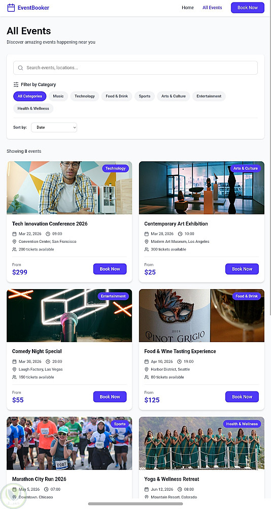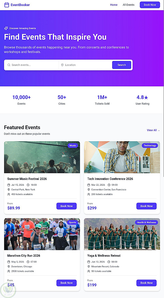 قمت بتصميم واجهة موقع ويب متكاملة لحجز واستكشاف الفعاليات المختلفة مثل الحفلات الموسيقية، المؤتمرات، الأنشطة الرياضية، وورش العمل، بأسلوب عصري يجمع بين الجمال وسهولة الاستخدام.