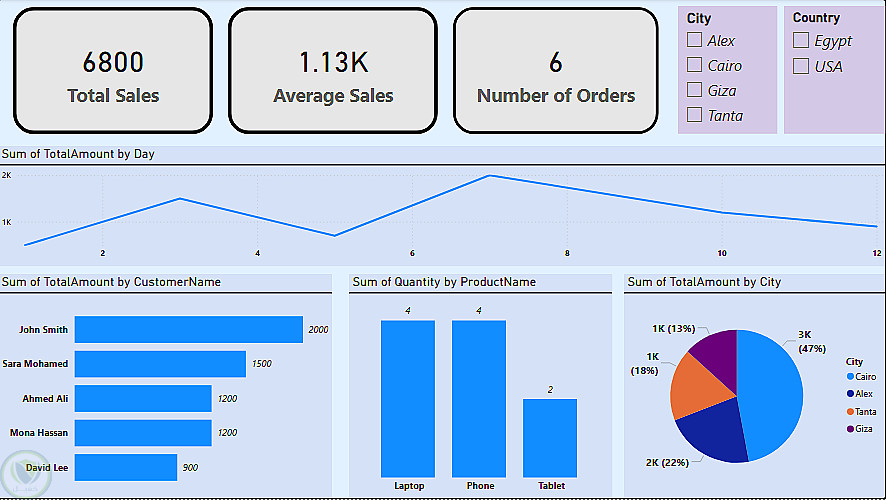 متابعة المؤشرات الرئيسية (KPIs): عرض إجمالي المبيعات (6800)، متوسط المبيعات لكل طلب (1.13K)، وإجمالي عدد الطلبات.