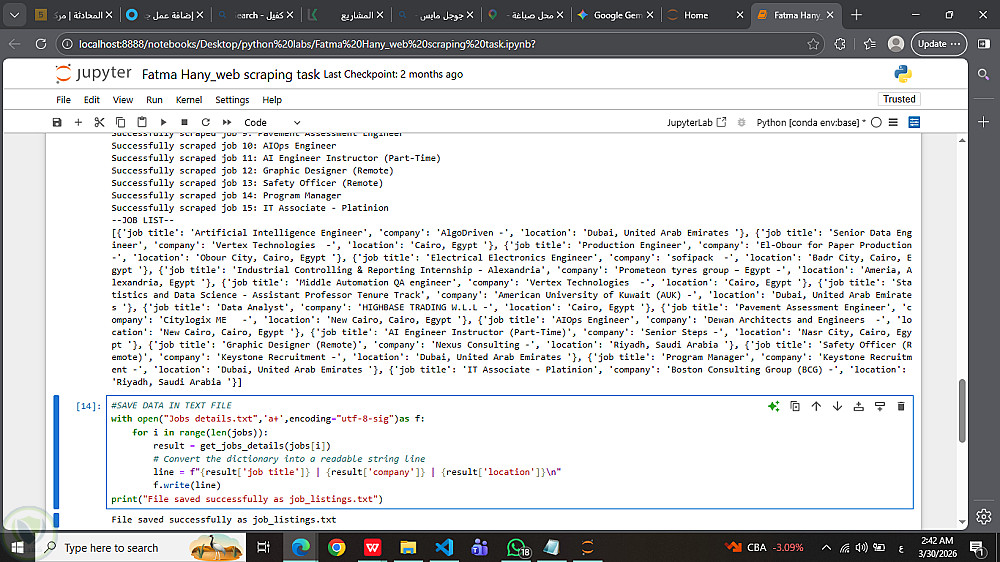 قمت بتطوير سكربت متقدم باستخدام لغة Python مخصص لاستخراج بيانات الوظائف من موقع "Wuzzuf". المشروع يهدف إلى أتمتة عملية جمع البيانات المشتتة وتحويلها إلى ملفات منظمة سهلة القراءة والتحليل (Excel & Text)، مما يساعد الباحثين عن عمل أو محللي البيانات في تتبع سوق العمل بكفاءة.