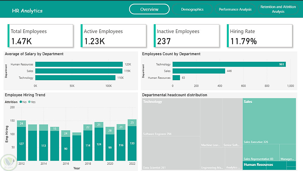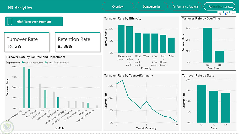 الاستقالة والاحتفاظ (Attrition & Retention): تحلل معدلات الاستقالة والأقسام الأكثر تأثرًا، مع دراسة الأسباب والعوامل لدعم استراتيجيات الاحتفاظ بالموظفين.