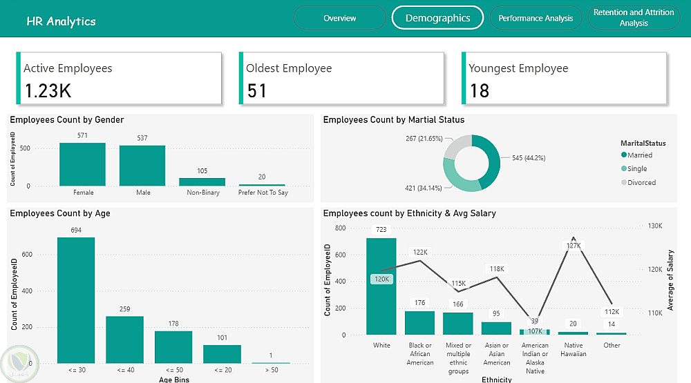 التحليل الديموغرافي (Demographics): تركز على العمر، الجنس، والحالة الاجتماعية لقياس التنوع واكتشاف أي عدم توازن يؤثر على بيئة العمل.